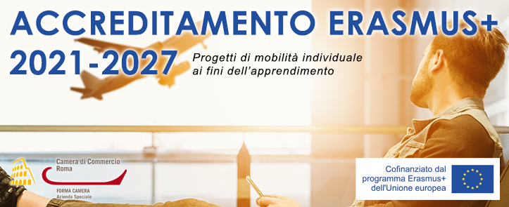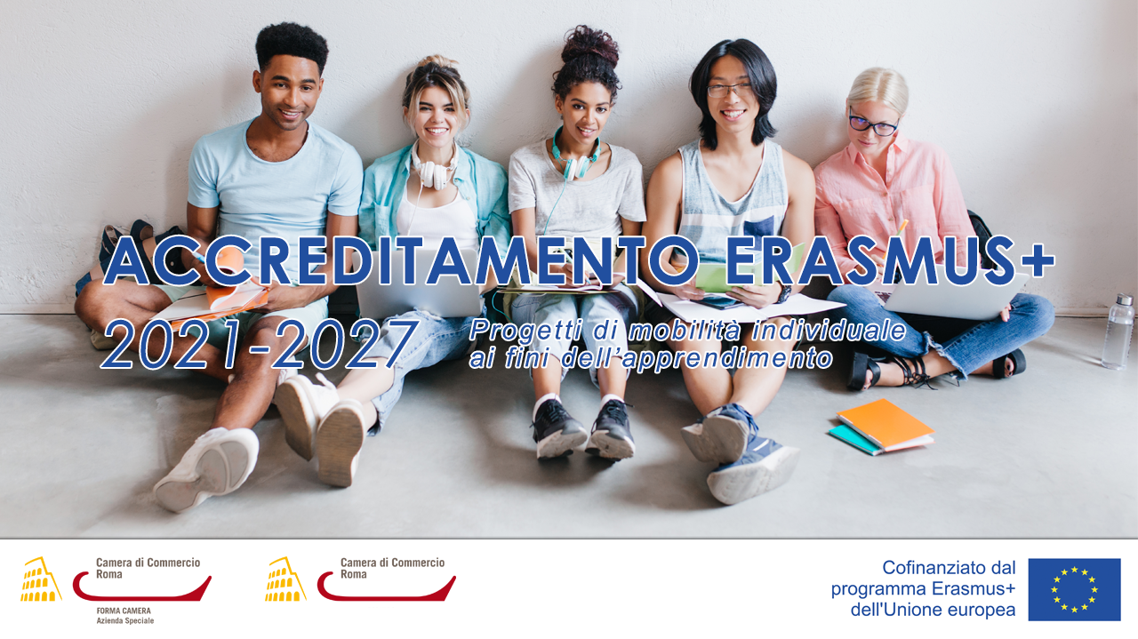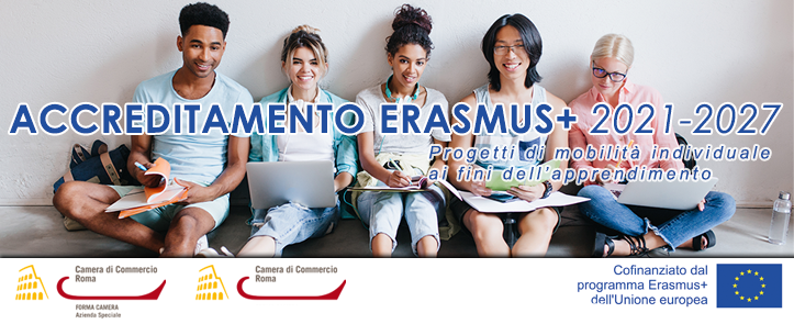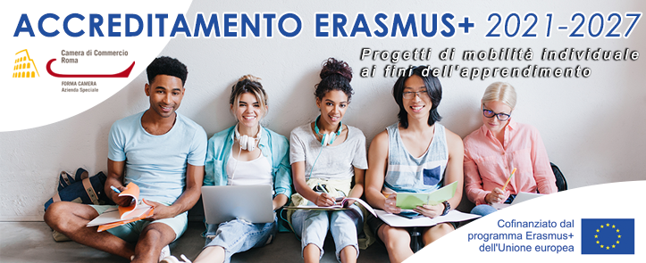 ragazzi felici con computer e bloc notes, accreditamento forma camera 2021-2027, Erasmus plus, logo forma camera, logo camera di commercio di roma