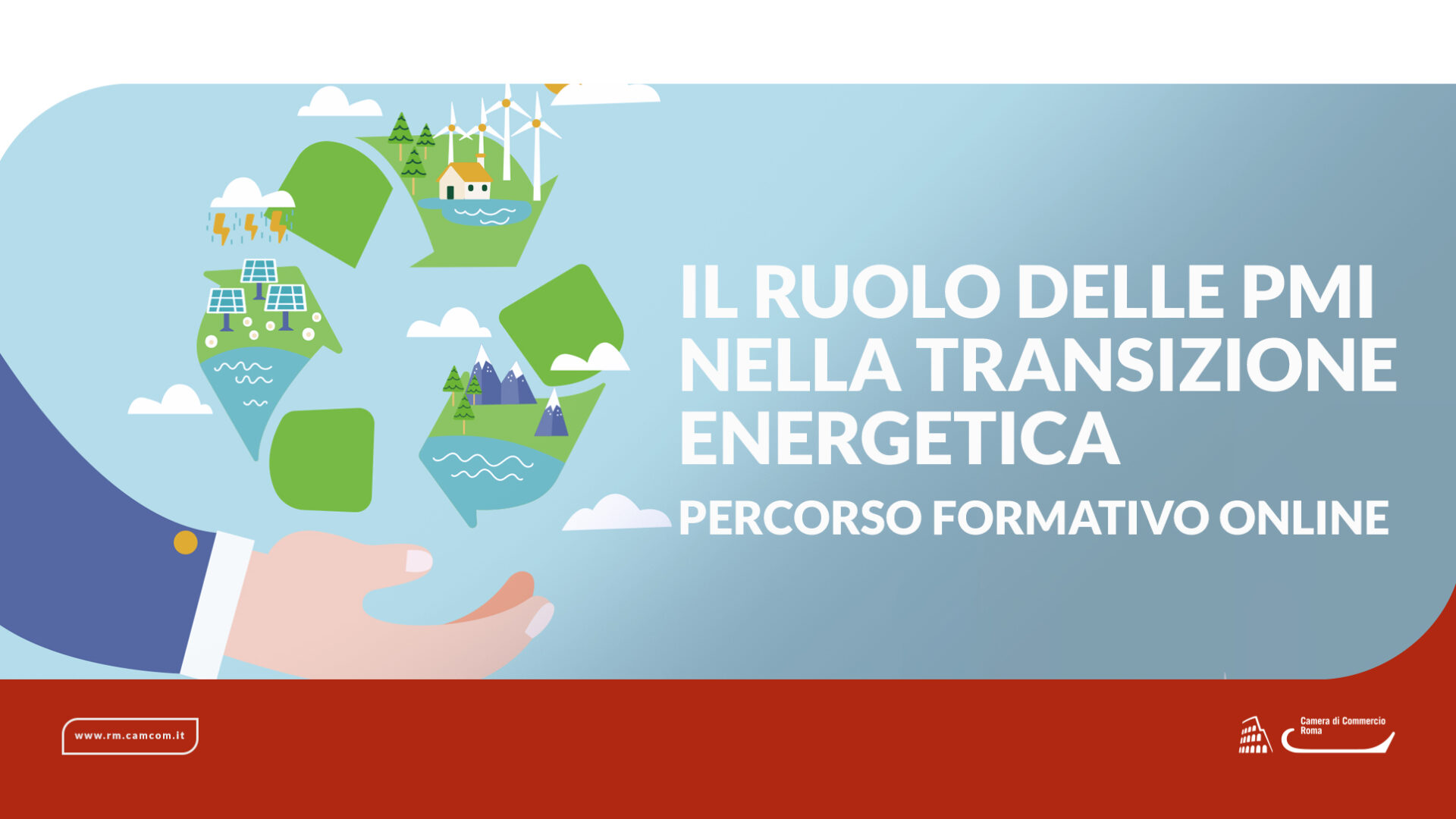 Il ruolo delle PMI nella transizione energetica, mano che supporta concetti green, logo camera di commercio di roma