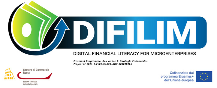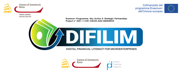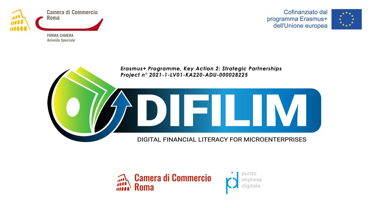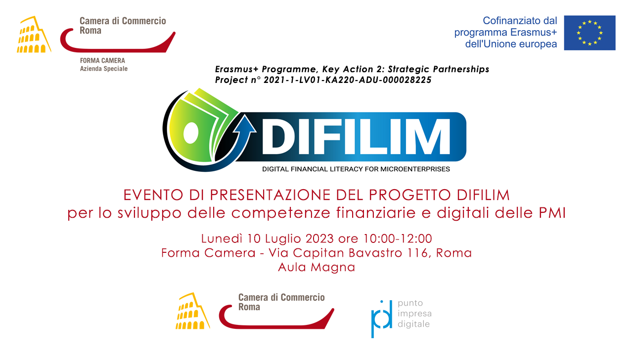 logo progetto difilim, evento di presentazione del 10 luglio 2023, logo forma camera, logo erasmusplus, logo camera di commercio di roma, logo punto impresa digitale