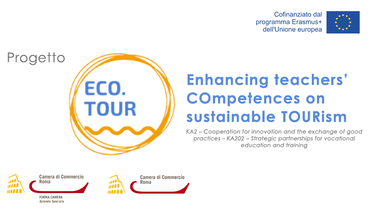 logo progetto eco.tour, logo erasmus plus, logo forma camera, logo camera di commercio di roma