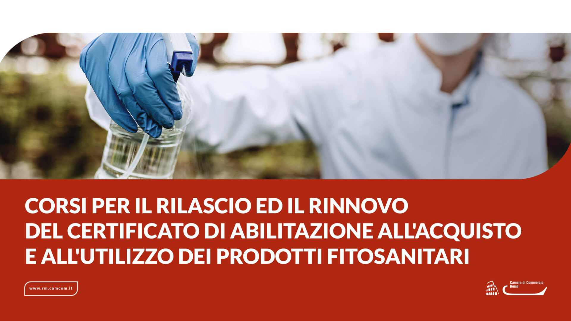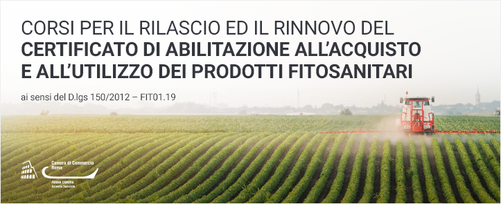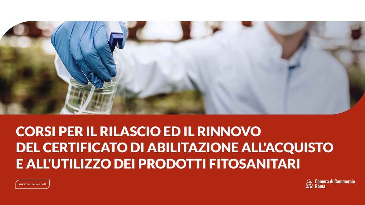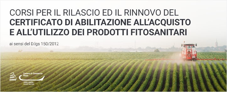 corso per il rilascio ed il rinnovo del certificato di abilitazione all'acquisto e all'utilizzo dei prodotti fitosanitari, operatore fitosanitario, logo camera di commercio di roma