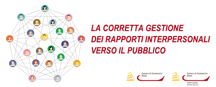 titolo del corso "la corretta gestione dei rapporti interpersonali verso il pubblico", network di persone, logo camera di commercio di roma, logo forma camera